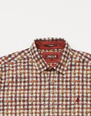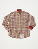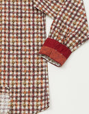 - Onderkraag, kraagband en binnenkant manchet in contrasterende stof
