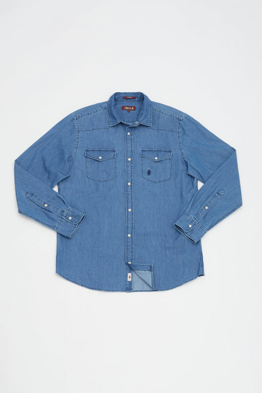 Omschrijving: __________ Denim westernoverhemd met klepzakken: - Denim stof - Westers juk - 2 klepzakken -Snaps - Rechte snit - Geborduurd logo op het hart - Zachte kraag - 100% katoen Maat advies: - Breedte 1/2 borstomtrek: 54...