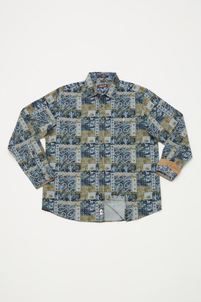 Overhemd met cowboy-patchworkprint:- Poplin overhemd met patchworkprint- Onderkraag, kraagband en binnenkant manchet in contrasterende stof- Rechte snit- Geborduurd logo op het hart- Zachte kraag- Gekleurde biezen ...