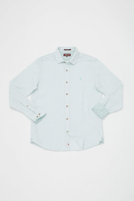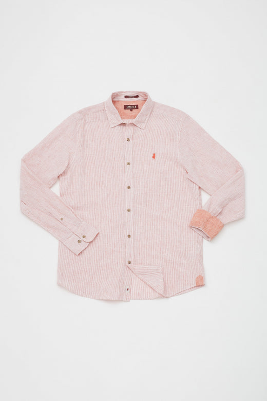 Gestreept linnen overhemd: - Fijne krasjes - Kraag en manchet manchet in effen stoffen - Knopen in houtstijl - Geborduurd logo in het hart - 100% linnen Snoeitip: - Breedte 1/2 borstomtrek: 54 cm voor maat L Onderhoudsinstructi...